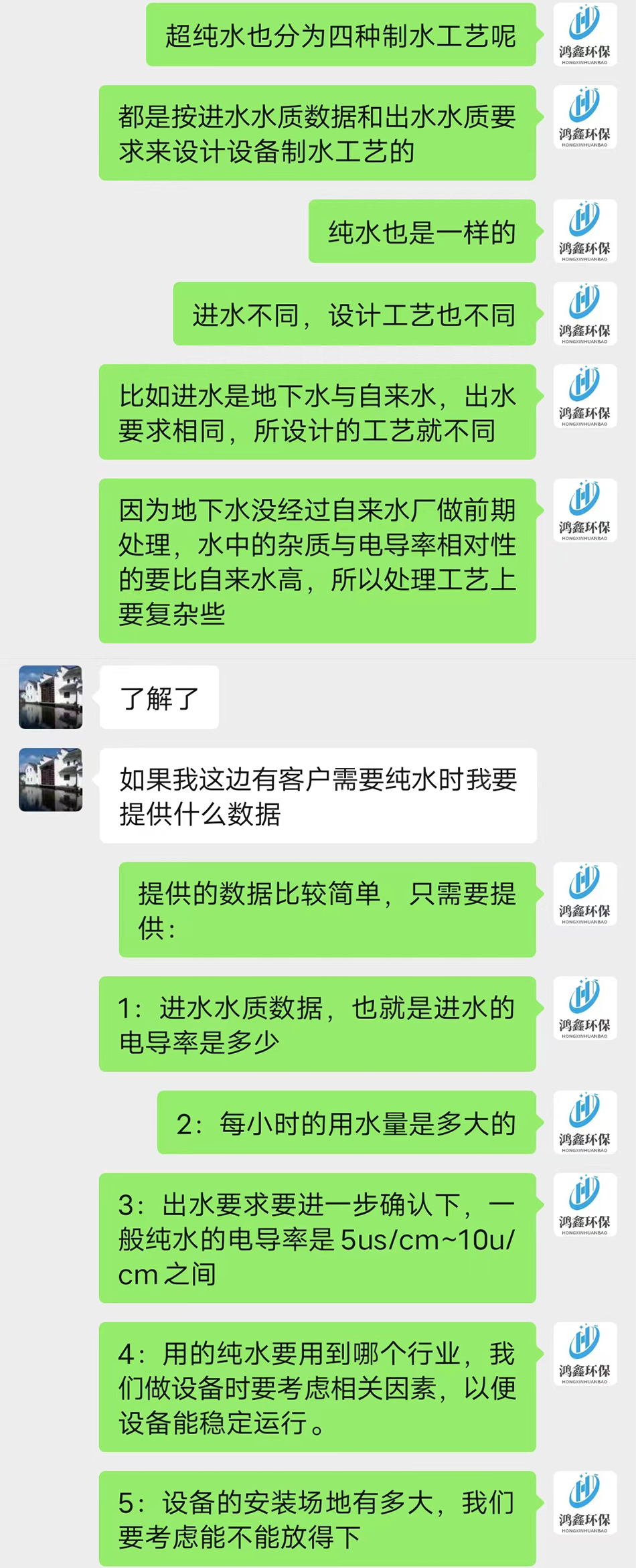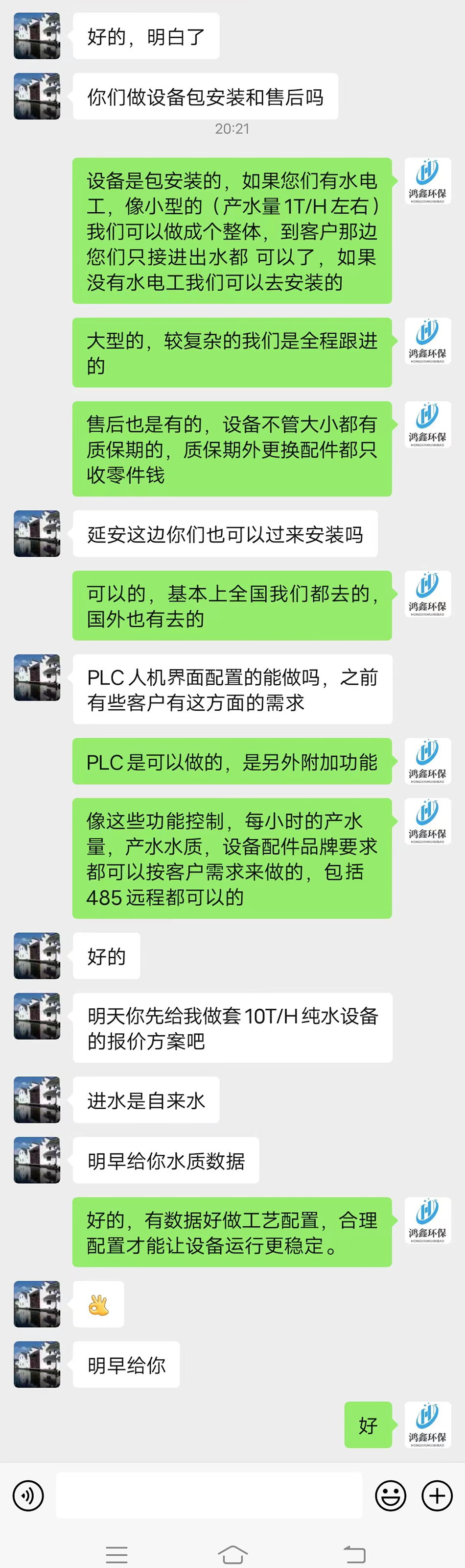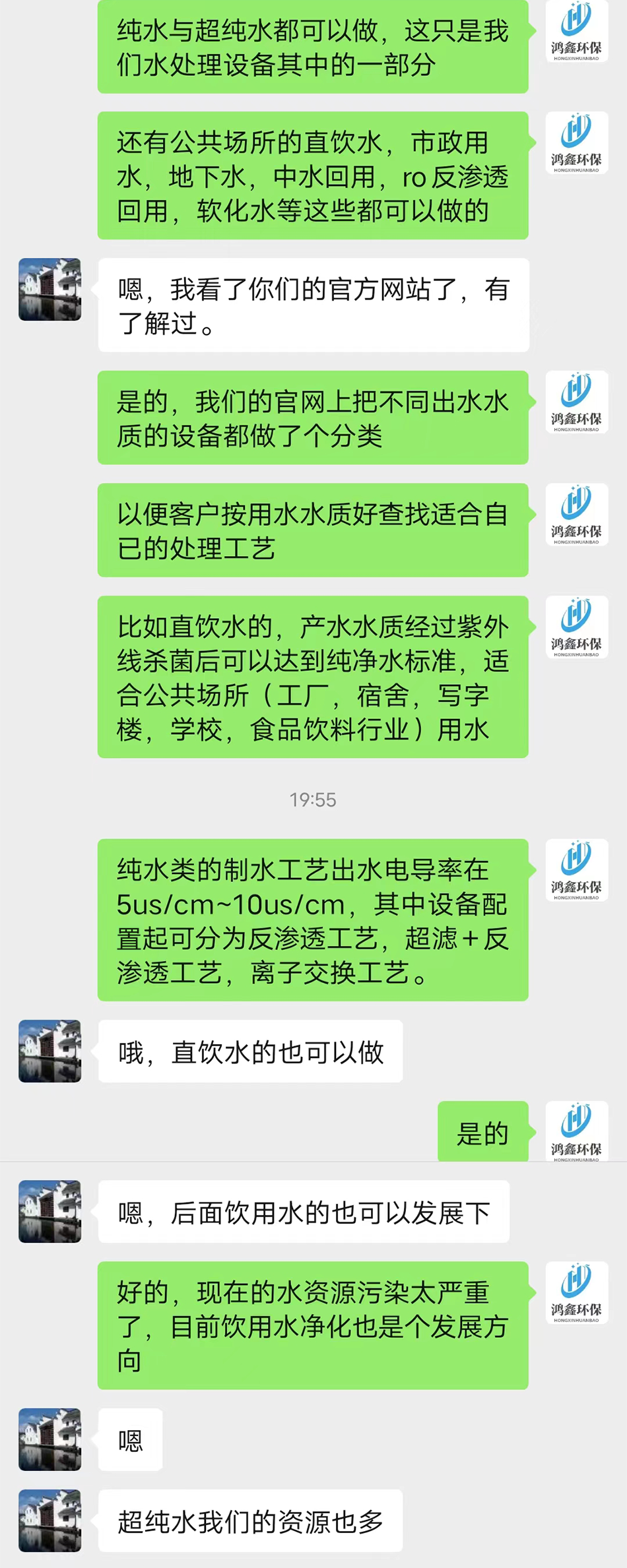 鴻鑫環(huán)保設(shè)備15年專注于水處理凈化工藝的設(shè)計(jì)、生產(chǎn)銷售安裝、設(shè)備維護(hù)、設(shè)備出租、技術(shù)服務(wù)為一體的一條龍服務(wù)企業(yè),所有的設(shè)備可依據(jù)客戶需求來(lái)定制,定制的設(shè)備類型有:市政生活用水處理設(shè)備、直飲純凈水設(shè)備、超濾處理設(shè)備、ro反滲透純水設(shè)備,離子交換純水設(shè)備、EDI超純水設(shè)備、軟化水處理設(shè)備、RO濃水回收設(shè)備、中水回用設(shè)備。