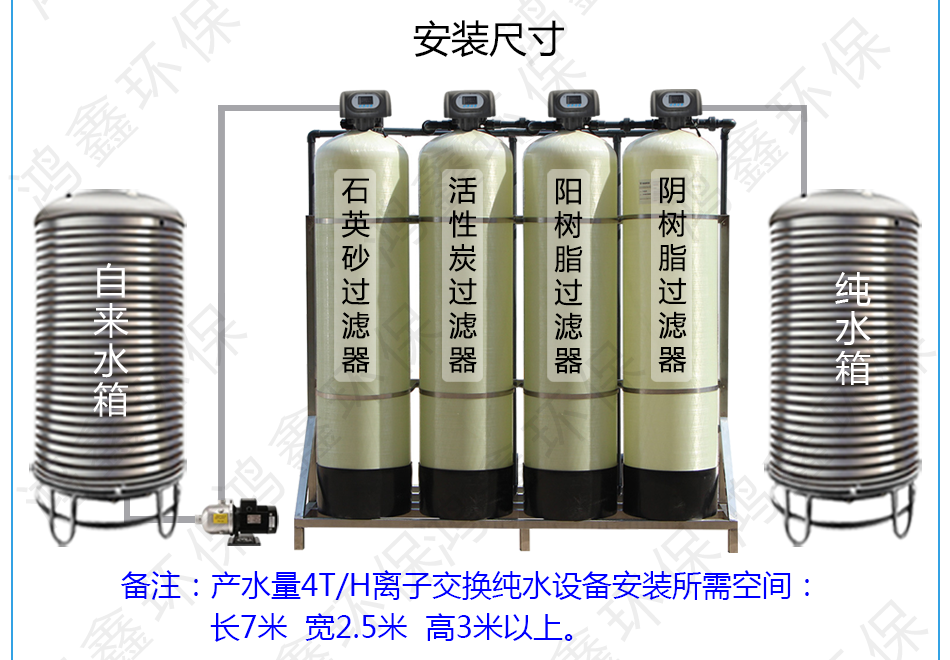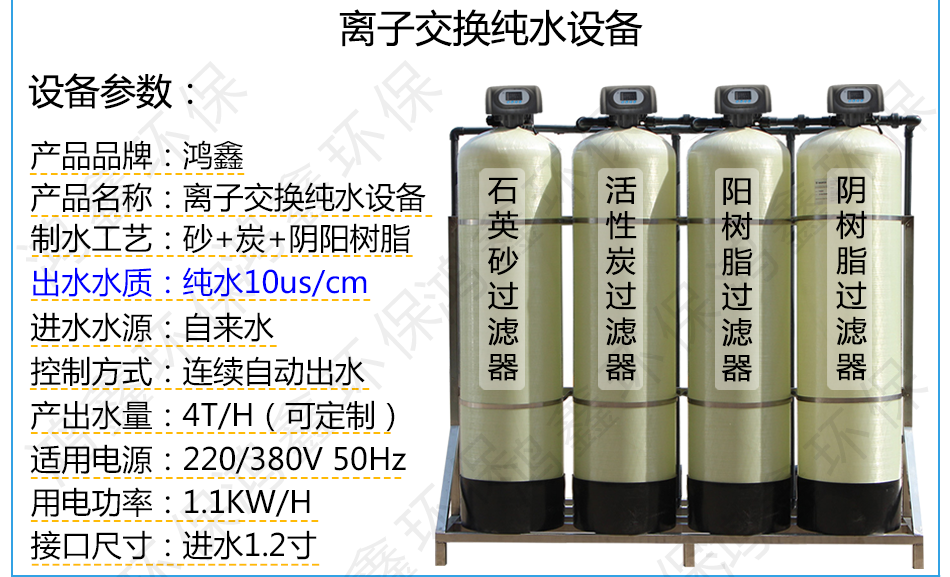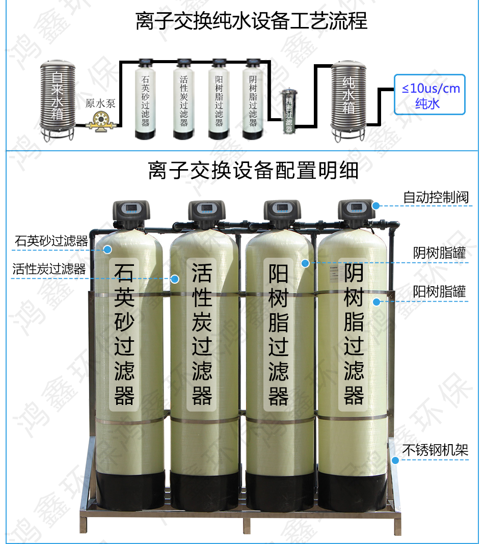 離子交換純水設備是傳統(tǒng)的去離子水設備,適應處理自來水,設備造價相對較低,出水量大、,非常適合于用水量大的產(chǎn)線,它的制水工藝是由原水箱+原水泵+石英砂過濾器+活性炭過濾器+陰樹脂過濾器+陽樹脂過濾器+純水箱。