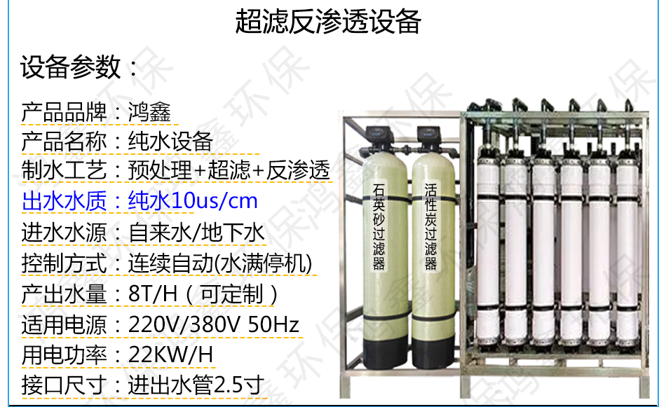 超濾反滲透設(shè)備是由:原水箱+原水泵+石英砂過濾器+活性炭過濾器+超濾膜系統(tǒng)+RO反滲透主機(jī)過濾系統(tǒng)+純水箱這些裝置組成,產(chǎn)水電導(dǎo)率在5us/cm~10us/cm之間。