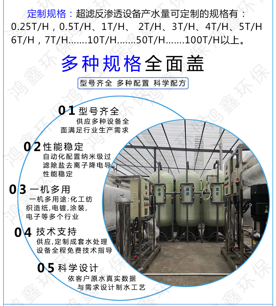 鴻鑫環(huán)保專業(yè)定制:市政生活用水處理設(shè)備、直飲純凈水設(shè)備超濾水處理設(shè)備、ro反滲透純水設(shè)備,離子交換純水設(shè)備、EDI超純水設(shè)備、軟化水處理設(shè)備、RO濃水回收設(shè)備、中水回用設(shè)備。