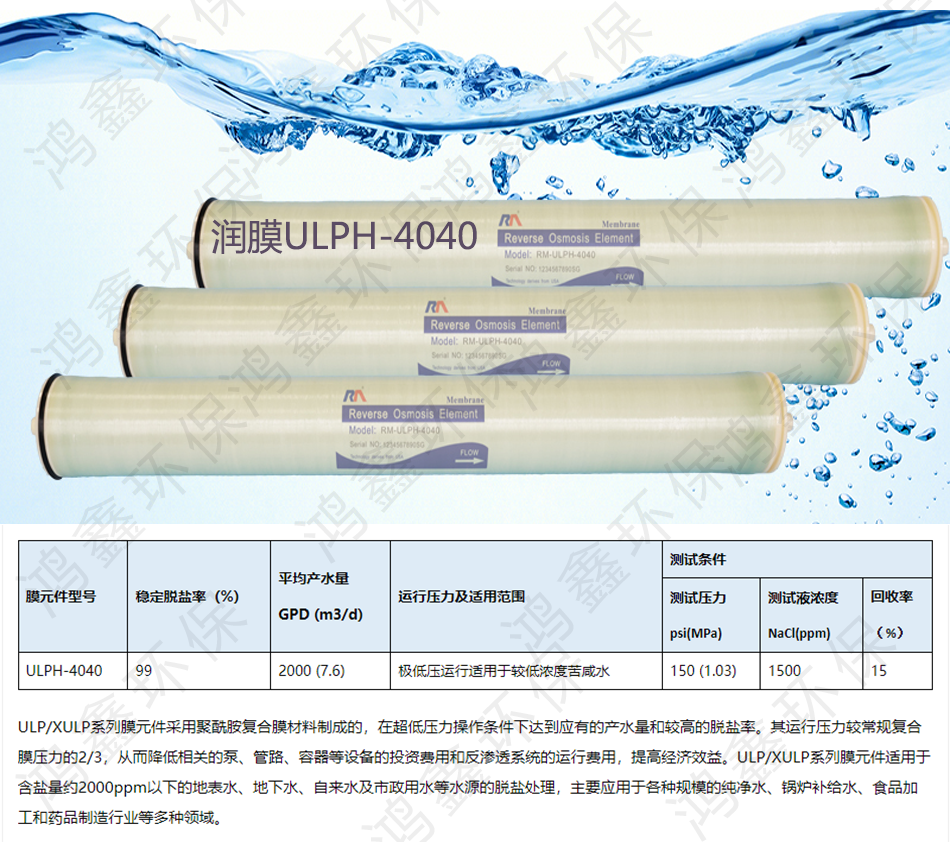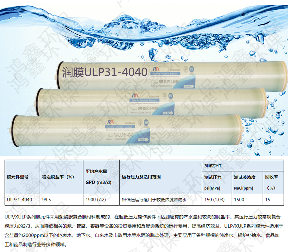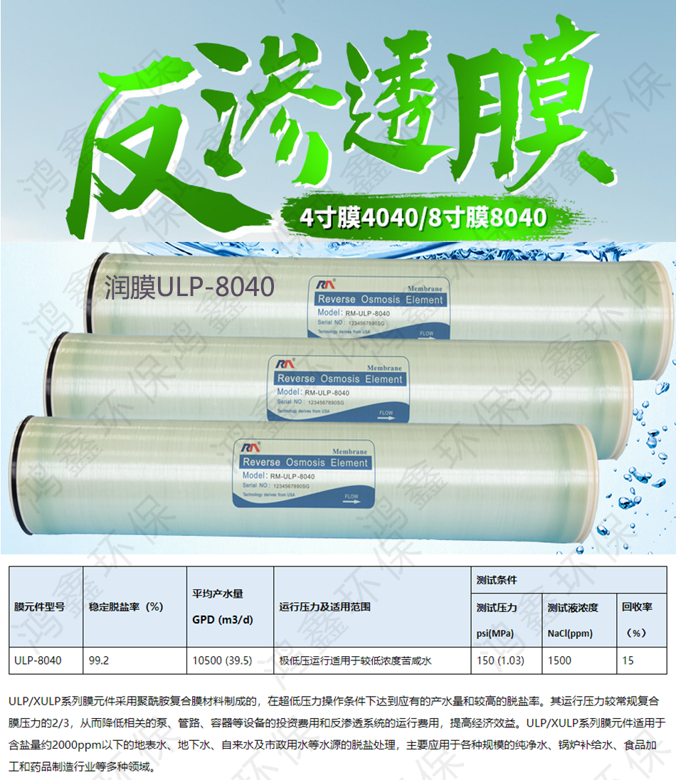潤膜反滲透RO膜是通過高壓泵對過原水施加大于滲透壓的壓力,利用 RO 膜的分離技術(shù),有效分離出原水中大于 200 的幾乎包括所有顆粒、膠體、有機雜質(zhì)、微生物等有害物及99%的溶解鹽,達到脫鹽純化的目的,使純水電導率≤10us,(原水電導率≤300us)。