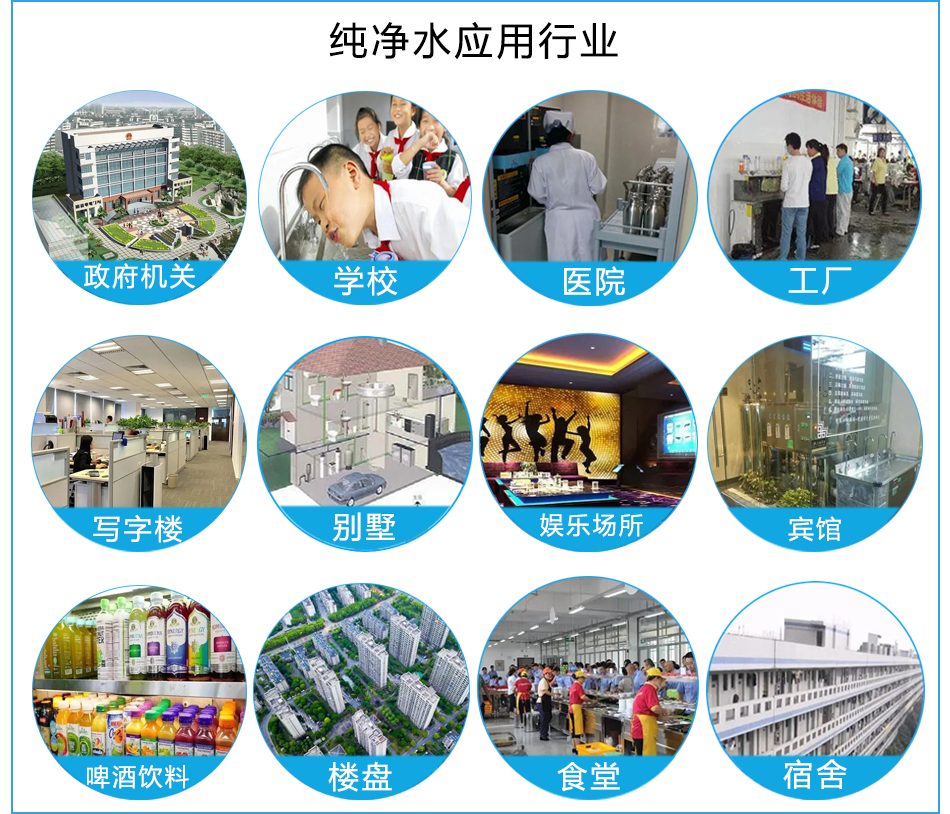 目前反滲透純凈水設(shè)備現(xiàn)已進入家庭,公司,商場,銀行,辦公室,寫字樓,招待所,會議室和賓館客房,酒吧,卡拉OK廳,醫(yī)院,車站,宿舍,工廠,等各種場所使用,可以說是家喻戶曉了