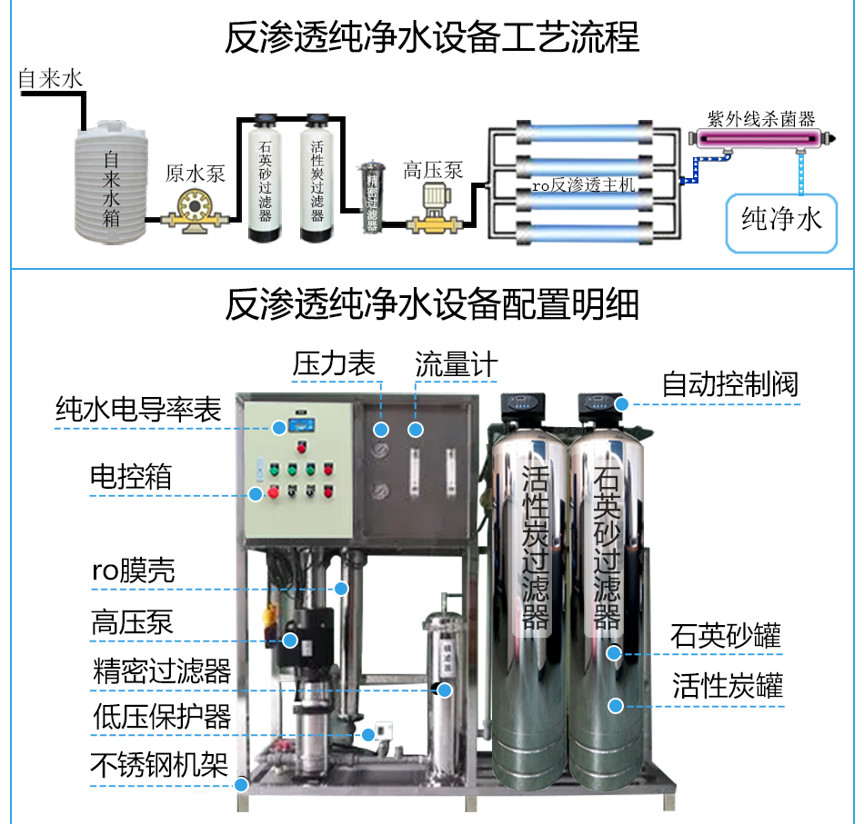 反滲透純凈水設(shè)備也是直飲水設(shè)備,由原水箱+原水泵+石英砂過濾器+活性炭過濾器+RO反滲透主機過濾系統(tǒng)+紫外線殺菌器+純水箱這些裝置組成,其實也是純水設(shè)備+紫外線殺菌消毒后達(dá)到可以直飲的效果。