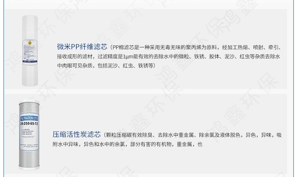 1:一級濾芯是孔徑為5微米溶噴PP棉,溶噴PP棉能有效去除自來水中較大固體物質(zhì)(如鐵銹、泥沙、水藻、懸浮物等),達(dá)到水質(zhì)的初步凈化。