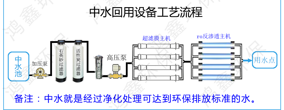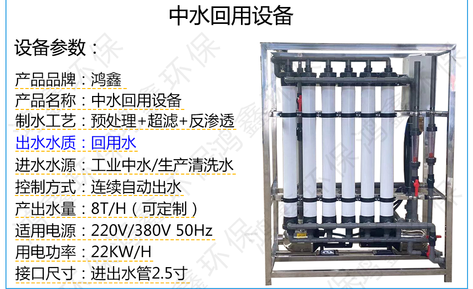 中水回用設(shè)備就是工業(yè)廢水經(jīng)過(guò)深度技術(shù)處理、去除各種雜質(zhì)、有毒有害物質(zhì)及某些重屬離子,使其水體無(wú)色無(wú)味、水質(zhì)清透明、重新應(yīng)用于生產(chǎn),節(jié)省水資源。