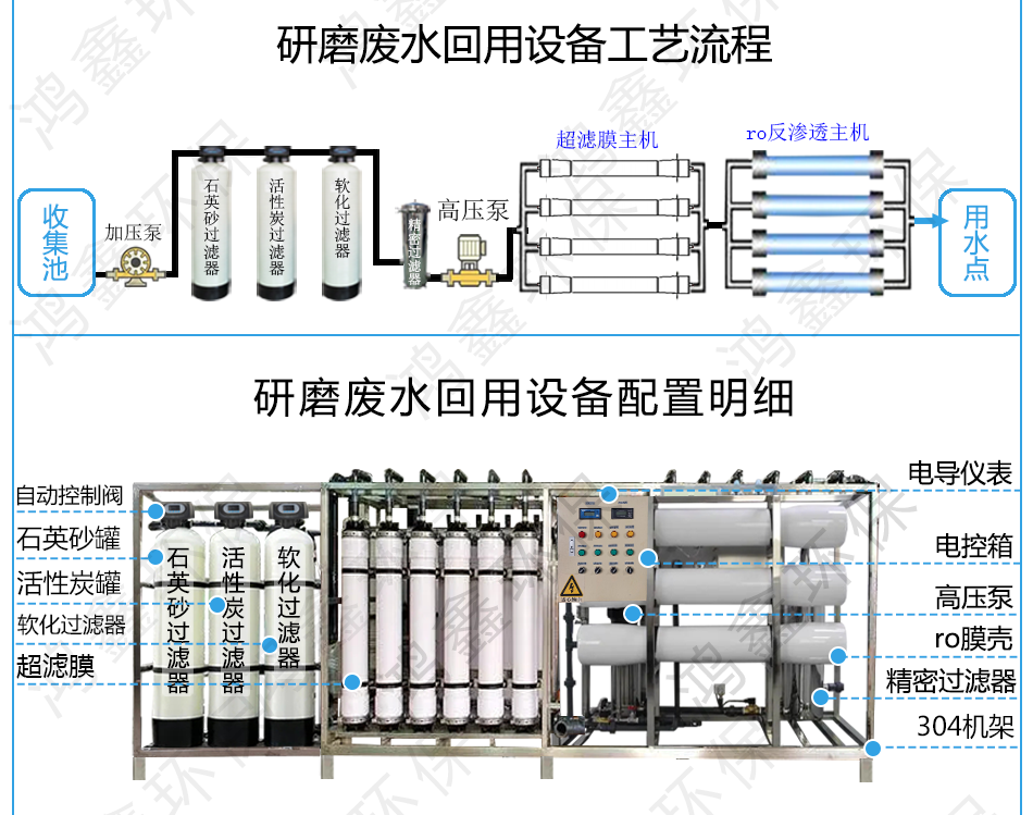 廢水收集池→PH值調(diào)節(jié)→絮凝→斜板沉淀→清水池→石英砂過濾→活性炭過濾→超濾→RO反滲透系統(tǒng)→回用水箱→回到使用點(diǎn)