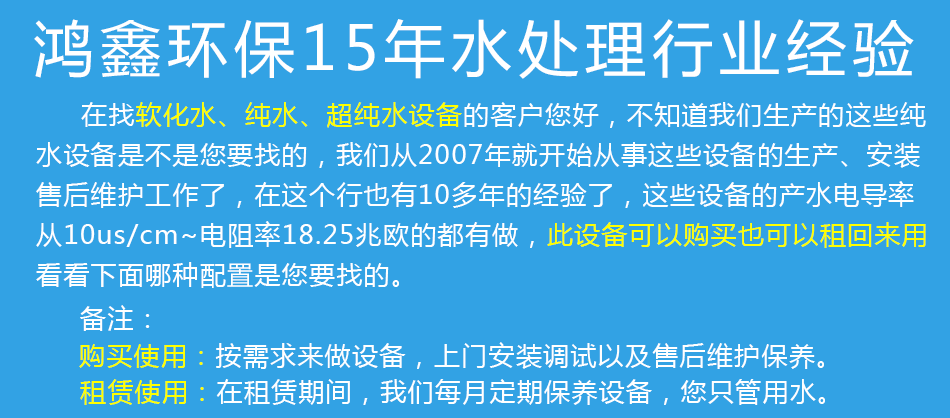 15年來(lái)專(zhuān)注于水處理凈化工藝的設(shè)計(jì)生產(chǎn)銷(xiāo)售、安裝、設(shè)備維護(hù)、設(shè)備出租技術(shù)服務(wù)為一體的一條龍服務(wù)企業(yè),定制的設(shè)備類(lèi)型有:市政生活用水處理設(shè)備、直飲純凈水設(shè)備、超濾處理設(shè)備、ro反滲透純水設(shè)備,離子交換純水設(shè)備,EDI超純水設(shè)備、軟化水處理設(shè)備、RO濃水回收設(shè)備、中水回用設(shè)備