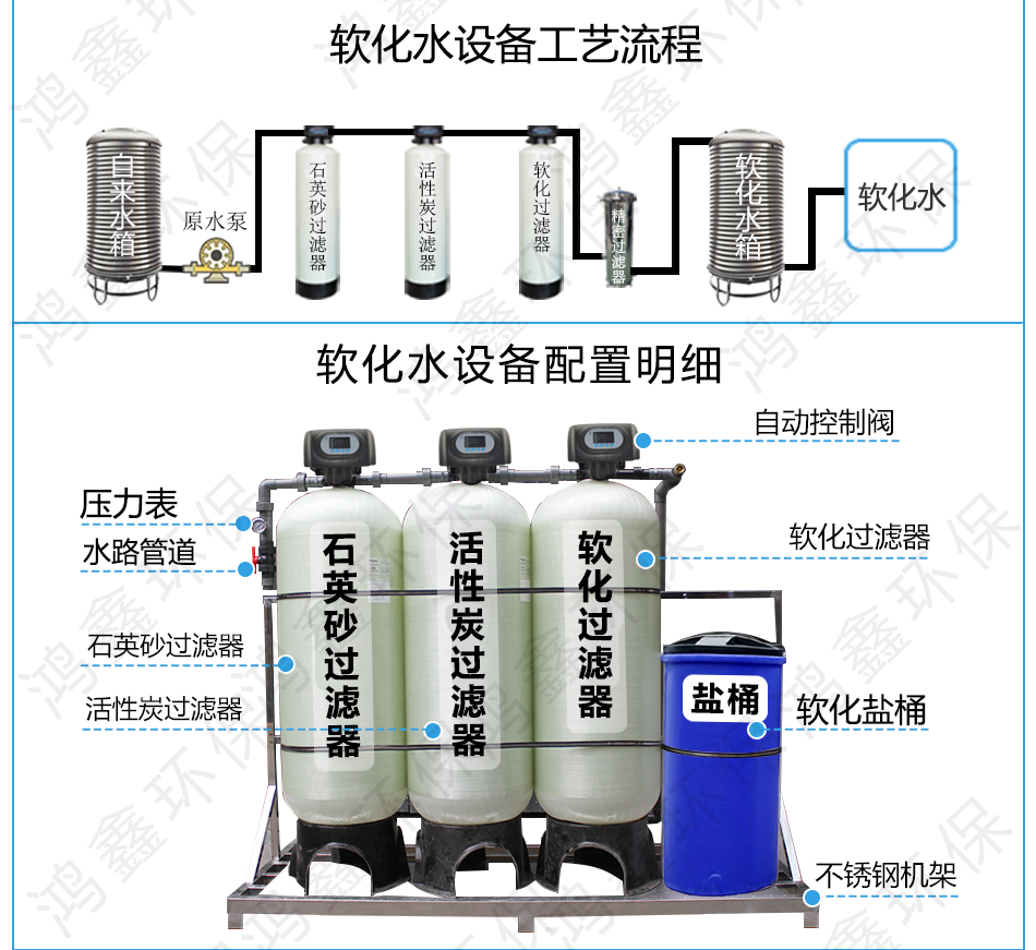 軟化水處理設(shè)備主要去除水中的鈣、鎂離子,降低水的硬度,使硬水變?yōu)檐浰?,主要是利用離子交換劑將水中的Ca2+、Mg+2轉(zhuǎn)換成Na+,其他陰離子成分不改變來達(dá)到軟化的。