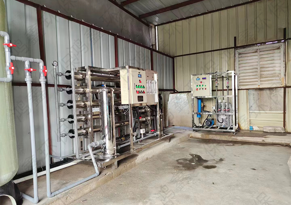 2: 原水箱→原水泵→石英砂過濾器→活性炭過濾器→雙級反滲透系統(tǒng)→edi系統(tǒng)→超純水箱=電阻率≤10Ω·m