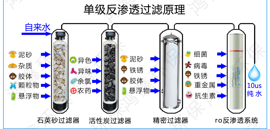 反滲透水處理成套設(shè)備包含了原水箱,原水泵,石英砂過(guò)濾器,活性炭過(guò)濾器,精密過(guò)濾器,ror反滲透主機(jī)系統(tǒng),純水箱,各部件之間的連接管道,這是對(duì)于處理原水是自來(lái)水(電導(dǎo)率100us/cm~350us/cm之間),產(chǎn)水電導(dǎo)率要求在5us/cm~10us/cm之間的一套水處理設(shè)備的最基本配置。