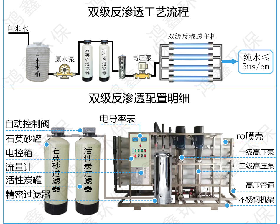 雙級(jí)反滲透純凈水設(shè)備的制水工藝: