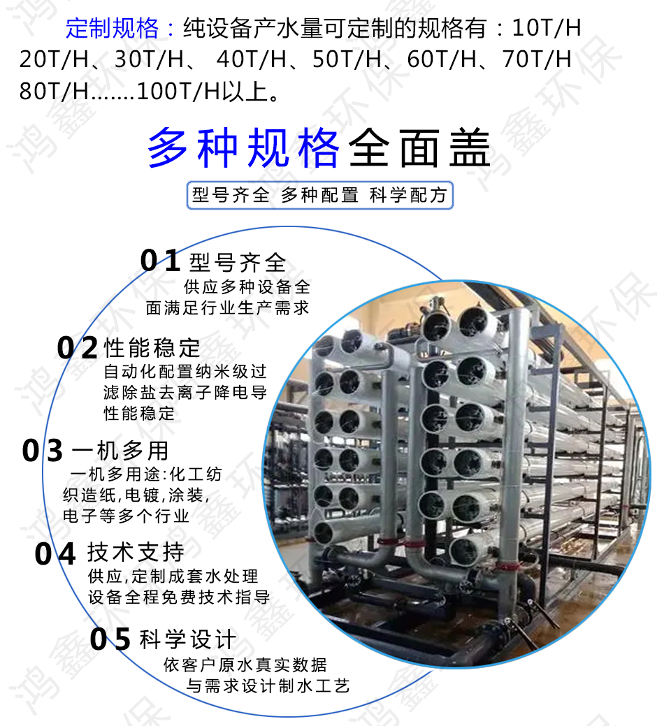 鴻鑫環(huán)保設(shè)備15年專(zhuān)注于水處理凈化工藝的設(shè)計(jì)、生產(chǎn)銷(xiāo)售安裝、設(shè)備維護(hù)、設(shè)備出租、技術(shù)服務(wù)為一體的一站式純水設(shè)備生產(chǎn)廠家,所有的設(shè)備可依據(jù)客戶(hù)需求來(lái)定制,定制的設(shè)備類(lèi)型有:市政生活用水處理設(shè)備、直飲純凈水設(shè)備、超濾處理設(shè)備、ro反滲透純水設(shè)備,離子交換純水設(shè)備、EDI超純水設(shè)備、軟化水處理設(shè)備、RO濃水回收設(shè)備、中水回用設(shè)備。