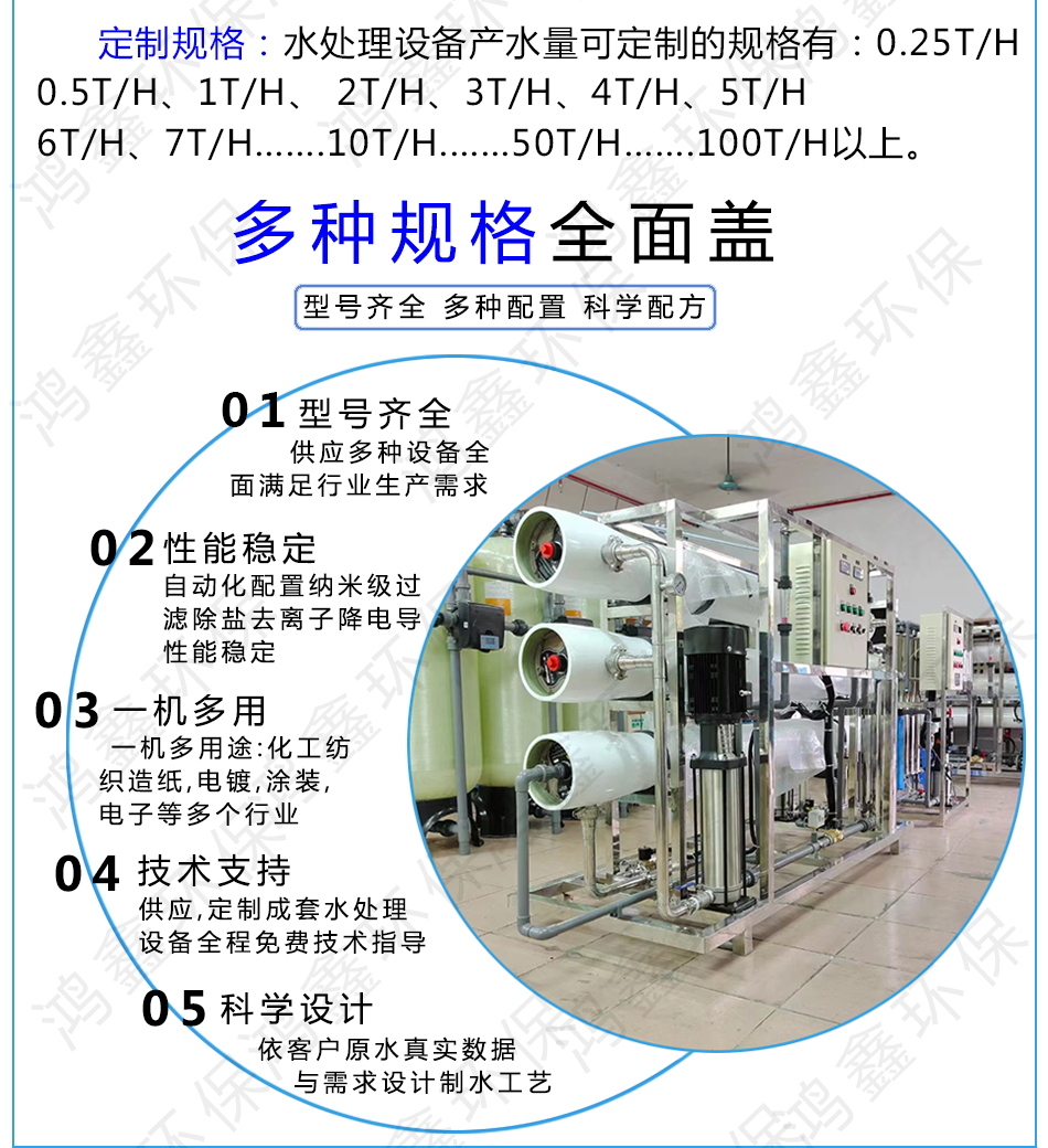 鴻鑫環(huán)保設(shè)備15年專注于水處理凈化工藝的設(shè)計(jì)、生產(chǎn)銷售安裝、設(shè)備維護(hù)、設(shè)備出租、技術(shù)服務(wù)為一體的一條龍服務(wù)企業(yè),所有的設(shè)備可依據(jù)客戶需求來定制,定制的設(shè)備類型有:市政生活用水處理設(shè)備、直飲純凈水設(shè)備、超濾處理設(shè)備、ro反滲透純水設(shè)備,離子交換純水設(shè)備、EDI超純水設(shè)備、軟化水處理設(shè)備、RO濃水回收設(shè)備、中水回用設(shè)備。