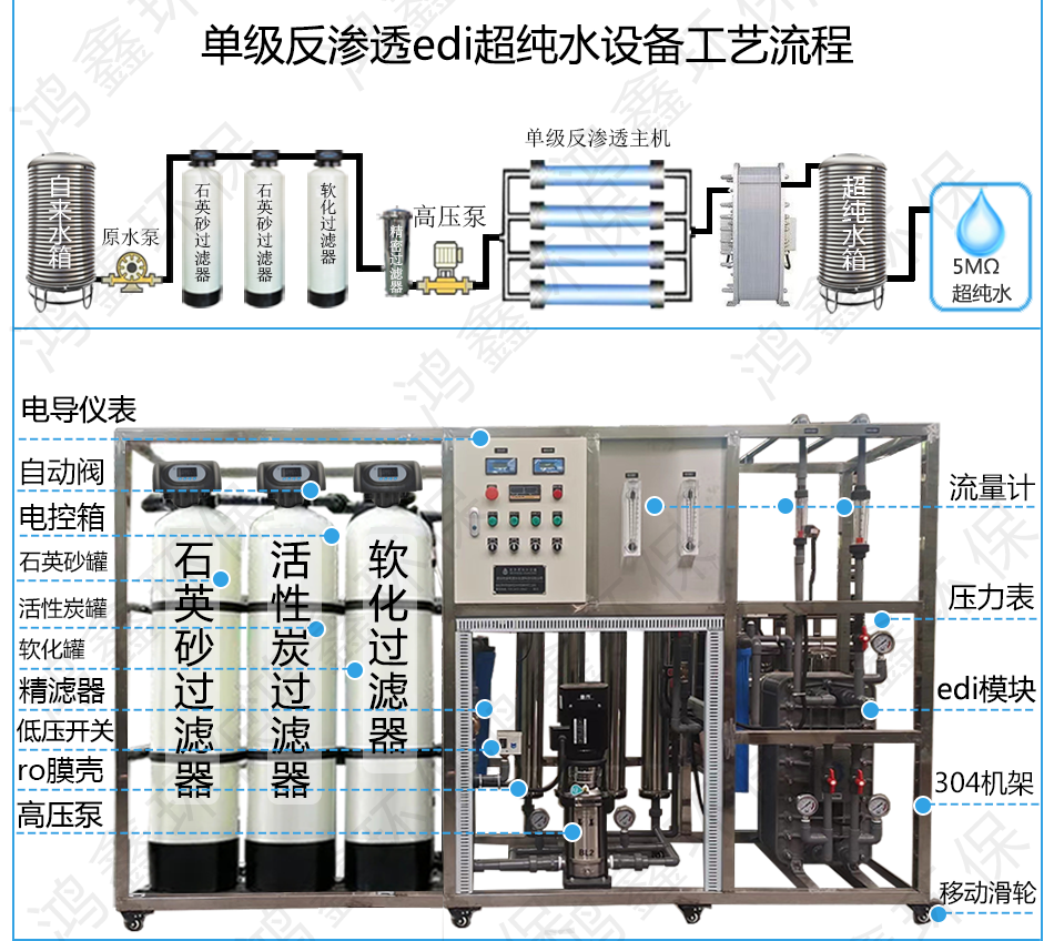 單級反滲透+edi: 原水箱+原水泵+石英砂過濾器+活性炭過濾器+軟化系統(tǒng)+單級反滲透系統(tǒng)+edi系統(tǒng)+超純水箱=電阻率≤5Ω·m